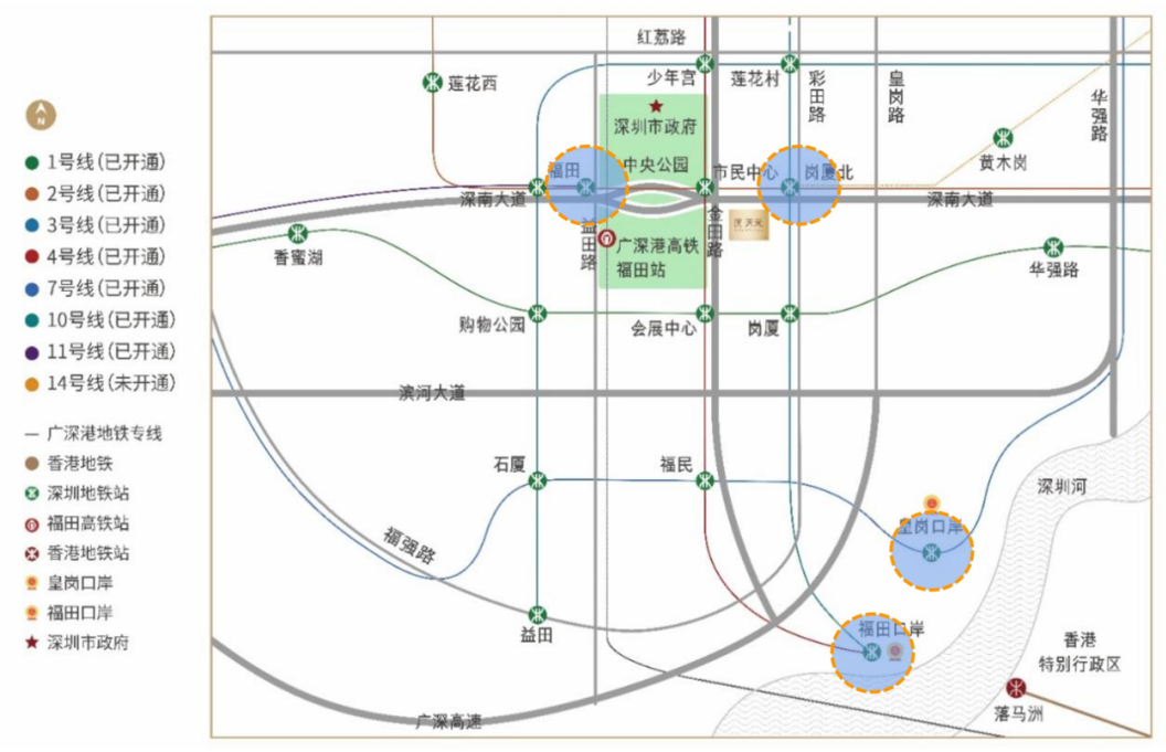 10號(hào)線(xiàn)連通東莞,14號(hào)線(xiàn)連通惠州,福田站高鐵連通香港、廣州,福田口岸、皇崗口岸直連香港北部都會(huì)區(qū)。20分鐘到香港,30分鐘到東莞,40分鐘到廣州。這是粵港澳大灣區(qū)的交通腹地,這才是真正的宇宙中心。