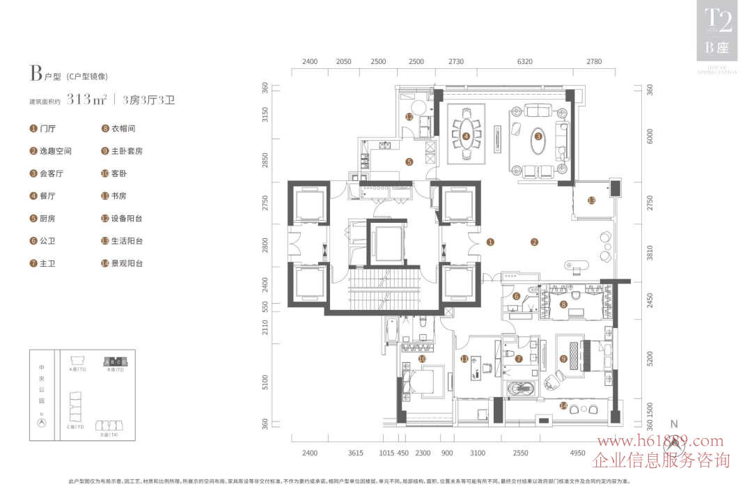 ②:313平米,在中間位置,也是雙向風(fēng)景,全南臥室