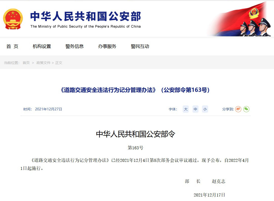 《道路交通安全違法行為記分管理辦法》已經(jīng)2021年12月4日第8次部務(wù)會議審議通過,現(xiàn)予公布,自2022年4月1日起施行。