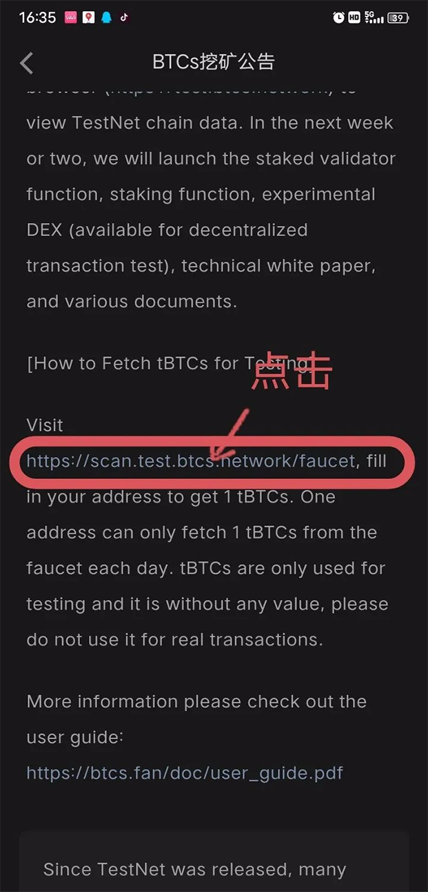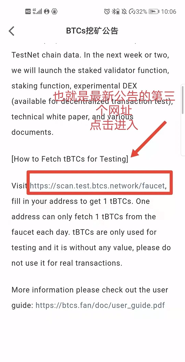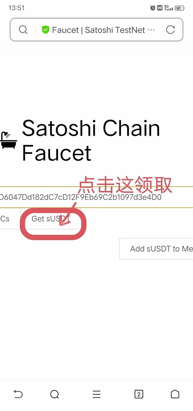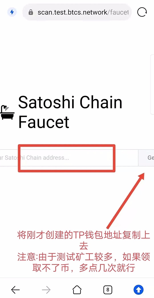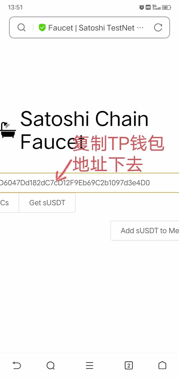 第⑥步:中本聰幣BTCs公鏈、TP錢包、中本聰測試代幣sUSDT、操作流程進(jìn)去網(wǎng)址、后復(fù)制TP錢包地址下去