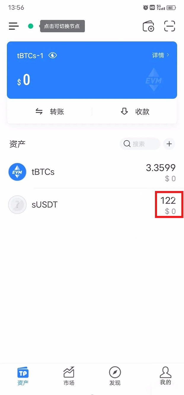 中本聰測試代幣sUSDT、操作流程、最后回到、TP錢包、刷新下、確認(rèn)sUSDT代幣到賬