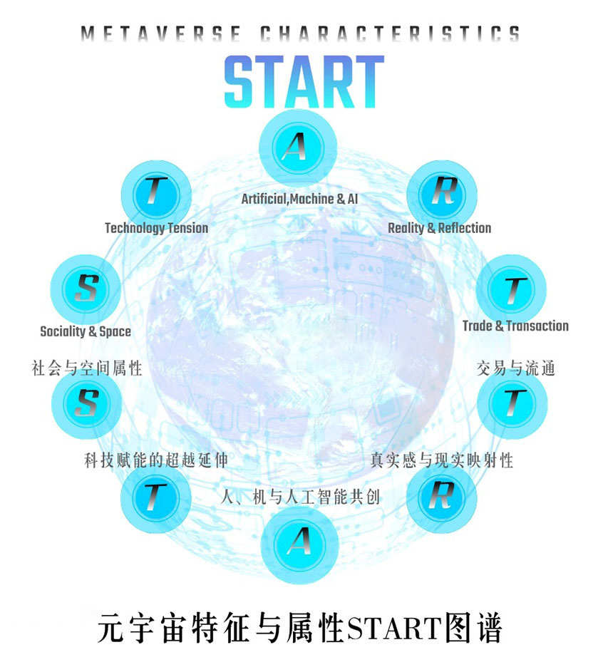 在元宇宙特征與屬性的START圖譜中,北京大學(xué)陳剛教授與董浩宇博士梳理并系統(tǒng)界定了元宇宙的五大特征與屬性,即:社會(huì)與空間屬性(Social & Space)、科技賦能的超越延伸(Technology Tension)、人、機(jī)與人工智能共創(chuàng)(ArtifIcal, Machine & AI)、真實(shí)感與現(xiàn)實(shí)映射性(Reality & Reflection)、交易與流通(Trade & Transaction)。
