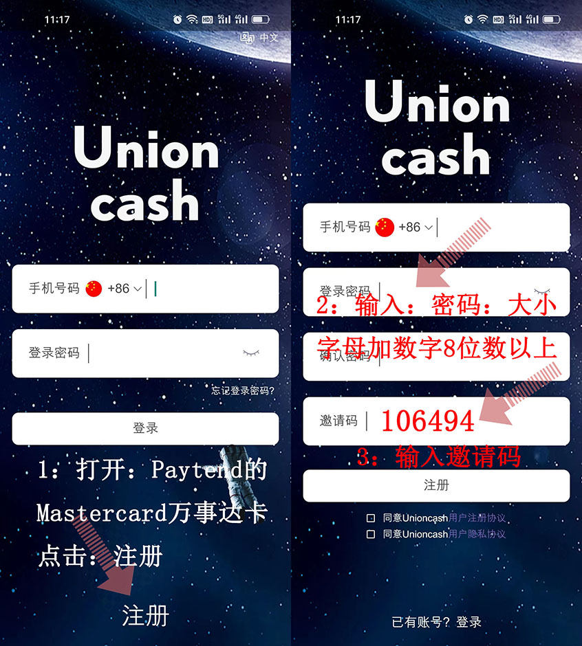 1:打開:萬事達(dá)卡 Union Cash 借記卡、點(diǎn)擊:注冊(cè)