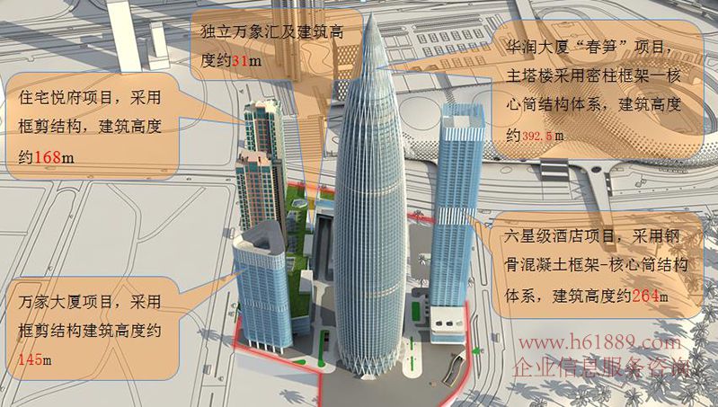 華潤總部大廈、總建筑面積77萬㎡占地8.57萬㎡、由392.5m華潤總部大廈、264m六星級酒店、145m萬家總部大廈、2棟168m悅府住宅、以及31m獨立萬象匯綜合商場組成、總投資200億元、是集商業(yè)辦公、酒店住宅、觀光娛樂、會議中心、交易中心、餐飲等為一體的大型綜合體建筑群、建成后將是深圳最大的商業(yè)綜合體
