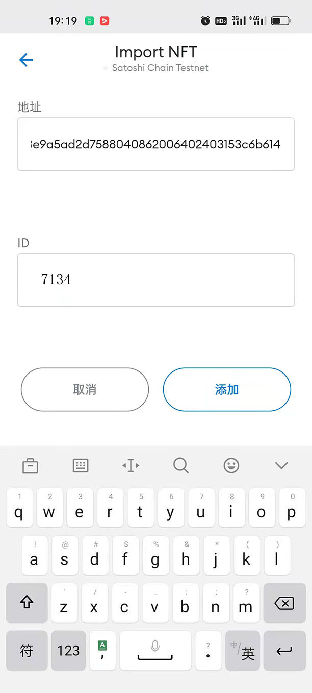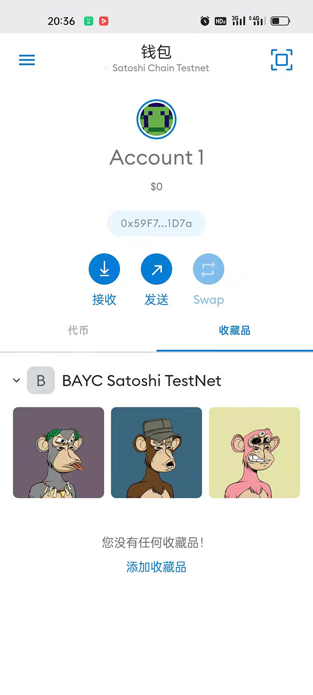 在收藏品界面輸入“合約地址”以及“編號(hào)”手動(dòng)添加顯示 NFT 無(wú)聊猿