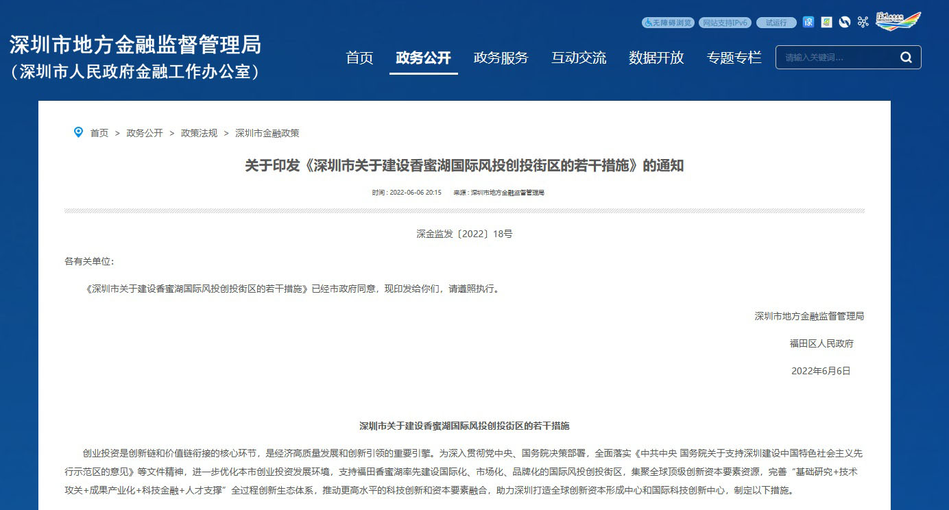 2022年6月6日晚,深圳市地方金融監(jiān)督管理局發(fā)布了《深圳市關(guān)于建設(shè)香蜜湖國際風(fēng)投創(chuàng)投街區(qū)的若干措施》的通知(以下簡稱《措施》)。