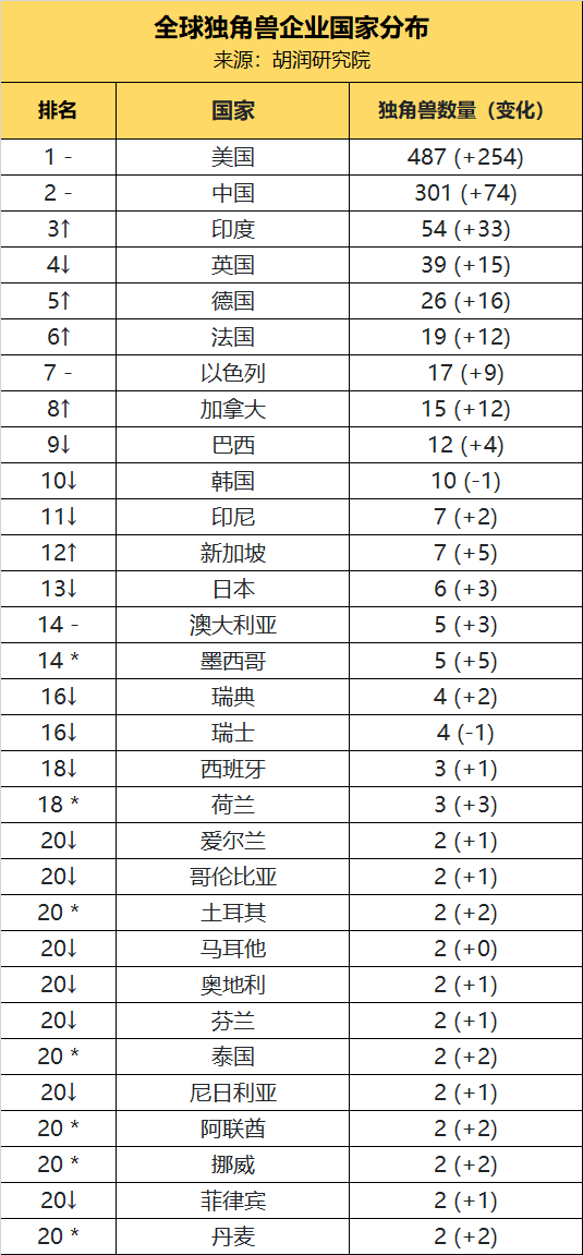 在全球獨角獸榜單中,美國以487家排名第一,比去年增加254家;中國以301家排名第二,比去年增加74家。中美兩國占全球獨角獸總數(shù)的74%,此外,印度獨角獸企業(yè)數(shù)量排名全球第3、英國第4、德國第5