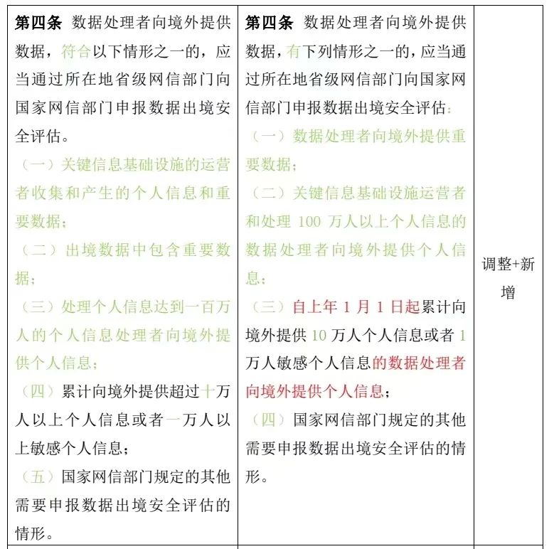 第四條 數(shù)據(jù)處理者向境外提供數(shù)據(jù),符合以下情形之一的,應(yīng)當(dāng)通過所在地省級(jí)網(wǎng)信部門向國(guó)家網(wǎng)信部門申報(bào)數(shù)據(jù)出境安全評(píng)估。(一)關(guān)鍵信息基礎(chǔ)設(shè)施的運(yùn)營(yíng)者收集和產(chǎn)生的個(gè)人信息和重要數(shù)據(jù); (二)出境數(shù)據(jù)中包含重要數(shù)據(jù); (三)處理個(gè)人信息達(dá)到一百萬(wàn)人的個(gè)人信息處理者向境外提供個(gè)人信息; (四)累計(jì)向境外提供超過十萬(wàn)人以上個(gè)人信息或者一萬(wàn)人以上敏感個(gè)人信息; (五)國(guó)家網(wǎng)信部門規(guī)定的其他需要申報(bào)數(shù)據(jù)出境安全評(píng)估的情形。 | 第四條 數(shù)據(jù)處理者向境外提供數(shù)據(jù),有下列情形之一的,應(yīng)當(dāng)通過所在地省級(jí)網(wǎng)信部門向國(guó)家網(wǎng)信部門申報(bào)數(shù)據(jù)出境安全評(píng)估: (一)數(shù)據(jù)處理者向境外提供重要數(shù)據(jù); (二)關(guān)鍵信息基礎(chǔ)設(shè)施運(yùn)營(yíng)者和處理100萬(wàn)人以上個(gè)人信息的數(shù)據(jù)處理者向境外提供個(gè)人信息; (三)自上年1月1日起累計(jì)向境外提供10萬(wàn)人個(gè)人信息或者1萬(wàn)人敏感個(gè)人信息的數(shù)據(jù)處理者向境外提供個(gè)人信息; (四)國(guó)家網(wǎng)信部門規(guī)定的其他需要申報(bào)數(shù)據(jù)出境安全評(píng)估的情形。 |