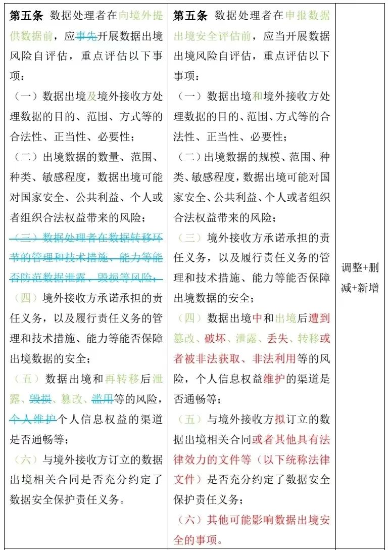 第五條 數(shù)據(jù)處理者在向境外提供數(shù)據(jù)前,應(yīng)事先開展數(shù)據(jù)出境風(fēng)險(xiǎn)自評(píng)估,重點(diǎn)評(píng)估以下事項(xiàng): (一)數(shù)據(jù)出境及境外接收方處理數(shù)據(jù)的目的、范圍、方式等的合法性、正當(dāng)性、必要性; (二)出境數(shù)據(jù)的數(shù)量、范圍、種類、敏感程度,數(shù)據(jù)出境可能對(duì)國(guó)家安全、公共利益、個(gè)人或者組織合法權(quán)益帶來(lái)的風(fēng)險(xiǎn); (三)數(shù)據(jù)處理者在數(shù)據(jù)轉(zhuǎn)移環(huán)節(jié)的管理和技術(shù)措施、能力等能否防范數(shù)據(jù)泄露、毀損等風(fēng)險(xiǎn); (四)境外接收方承諾承擔(dān)的責(zé)任義務(wù),以及履行責(zé)任義務(wù)的管理和技術(shù)措施、能力等能否保障出境數(shù)據(jù)的安全; (五)數(shù)據(jù)出境和再轉(zhuǎn)移后泄露、毀損、篡改、濫用等的風(fēng)險(xiǎn),個(gè)人維護(hù)個(gè)人信息權(quán)益的渠道是否通暢等; (六)與境外接收方訂立的數(shù)據(jù)出境相關(guān)合同是否充分約定了數(shù)據(jù)安全保護(hù)責(zé)任義務(wù)。 | 第五條 數(shù)據(jù)處理者在申報(bào)數(shù)據(jù)出境安全評(píng)估前,應(yīng)當(dāng)開展數(shù)據(jù)出境風(fēng)險(xiǎn)自評(píng)估,重點(diǎn)評(píng)估以下事項(xiàng): (一)數(shù)據(jù)出境和境外接收方處理數(shù)據(jù)的目的、范圍、方式等的合法性、正當(dāng)性、必要性; (二)出境數(shù)據(jù)的規(guī)模、范圍、種類、敏感程度,數(shù)據(jù)出境可能對(duì)國(guó)家安全、公共利益、個(gè)人或者組織合法權(quán)益帶來(lái)的風(fēng)險(xiǎn); (三)境外接收方承諾承擔(dān)的責(zé)任義務(wù),以及履行責(zé)任義務(wù)的管理和技術(shù)措施、能力等能否保障出境數(shù)據(jù)的安全; (四)數(shù)據(jù)出境中和出境后遭到篡改、破壞、泄露、丟失、轉(zhuǎn)移或者被非法獲取、非法利用等的風(fēng)險(xiǎn),個(gè)人信息權(quán)益維護(hù)的渠道是否通暢等; (五)與境外接收方擬訂立的數(shù)據(jù)出境相關(guān)合同或者其他具有法律效力的文件等(以下統(tǒng)稱法律文件)是否充分約定了數(shù)據(jù)安全保護(hù)責(zé)任義務(wù); (六)其他可能影響數(shù)據(jù)出境安全的事項(xiàng)。 |