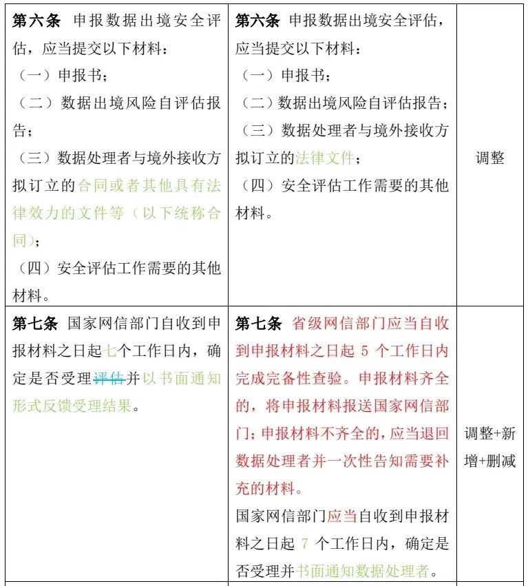 第七條 國(guó)家網(wǎng)信部門自收到申報(bào)材料之日起七個(gè)工作日內(nèi),確定是否受理評(píng)估并以書面通知形式反饋受理結(jié)果。 | 第七條 省級(jí)網(wǎng)信部門應(yīng)當(dāng)自收到申報(bào)材料之日起5個(gè)工作日內(nèi)完成完備性查驗(yàn)。申報(bào)材料齊全的,將申報(bào)材料報(bào)送國(guó)家網(wǎng)信部門;申報(bào)材料不齊全的,應(yīng)當(dāng)退回?cái)?shù)據(jù)處理者并一次性告知需要補(bǔ)充的材料。 國(guó)家網(wǎng)信部門應(yīng)當(dāng)自收到申報(bào)材料之日起7個(gè)工作日內(nèi),確定是否受理并書面通知數(shù)據(jù)處理者。 |