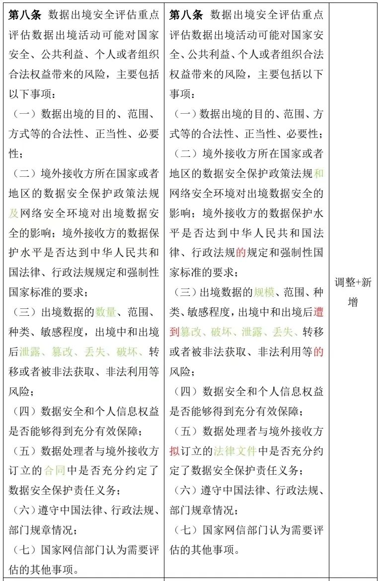 第八條 數(shù)據(jù)出境安全評(píng)估重點(diǎn)評(píng)估數(shù)據(jù)出境活動(dòng)可能對(duì)國(guó)家安全、公共利益、個(gè)人或者組織合法權(quán)益帶來(lái)的風(fēng)險(xiǎn),主要包括以下事項(xiàng): (一)數(shù)據(jù)出境的目的、范圍、方式等的合法性、正當(dāng)性、必要性; (二)境外接收方所在國(guó)家或者地區(qū)的數(shù)據(jù)安全保護(hù)政策法規(guī)及網(wǎng)絡(luò)安全環(huán)境對(duì)出境數(shù)據(jù)安全的影響;境外接收方的數(shù)據(jù)保護(hù)水平是否達(dá)到中華人民共和國(guó)法律、行政法規(guī)規(guī)定和強(qiáng)制性國(guó)家標(biāo)準(zhǔn)的要求; (三)出境數(shù)據(jù)的數(shù)量、范圍、種類、敏感程度,出境中和出境后泄露、篡改、丟失、破壞、轉(zhuǎn)移或者被非法獲取、非法利用等風(fēng)險(xiǎn); (四)數(shù)據(jù)安全和個(gè)人信息權(quán)益是否能夠得到充分有效保障; (五)數(shù)據(jù)處理者與境外接收方訂立的合同中是否充分約定了數(shù)據(jù)安全保護(hù)責(zé)任義務(wù); (六)遵守中國(guó)法律、行政法規(guī)、部門規(guī)章情況; (七)國(guó)家網(wǎng)信部門認(rèn)為需要評(píng)估的其他事項(xiàng)。 | 第八條 數(shù)據(jù)出境安全評(píng)估重點(diǎn)評(píng)估數(shù)據(jù)出境活動(dòng)可能對(duì)國(guó)家安全、公共利益、個(gè)人或者組織合法權(quán)益帶來(lái)的風(fēng)險(xiǎn),主要包括以下事項(xiàng): (一)數(shù)據(jù)出境的目的、范圍、方式等的合法性、正當(dāng)性、必要性; (二)境外接收方所在國(guó)家或者地區(qū)的數(shù)據(jù)安全保護(hù)政策法規(guī)和網(wǎng)絡(luò)安全環(huán)境對(duì)出境數(shù)據(jù)安全的影響;境外接收方的數(shù)據(jù)保護(hù)水平是否達(dá)到中華人民共和國(guó)法律、行政法規(guī)的規(guī)定和強(qiáng)制性國(guó)家標(biāo)準(zhǔn)的要求; (三)出境數(shù)據(jù)的規(guī)模、范圍、種類、敏感程度,出境中和出境后遭到篡改、破壞、泄露、丟失、轉(zhuǎn)移或者被非法獲取、非法利用等的風(fēng)險(xiǎn); (四)數(shù)據(jù)安全和個(gè)人信息權(quán)益是否能夠得到充分有效保障; (五)數(shù)據(jù)處理者與境外接收方擬訂立的法律文件中是否充分約定了數(shù)據(jù)安全保護(hù)責(zé)任義務(wù); (六)遵守中國(guó)法律、行政法規(guī)、部門規(guī)章情況; (七)國(guó)家網(wǎng)信部門認(rèn)為需要評(píng)估的其他事項(xiàng)。 |