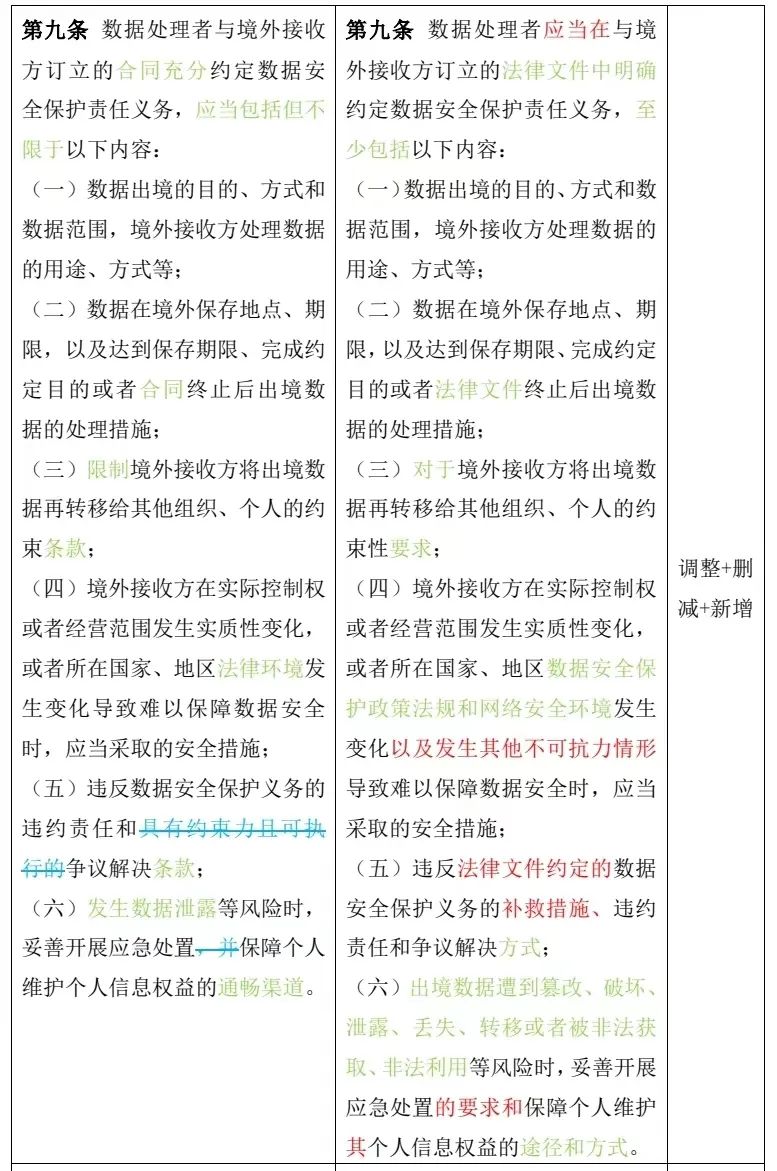 第九條 數(shù)據(jù)處理者與境外接收方訂立的合同充分約定數(shù)據(jù)安全保護(hù)責(zé)任義務(wù),應(yīng)當(dāng)包括但不限于以下內(nèi)容: (一)數(shù)據(jù)出境的目的、方式和數(shù)據(jù)范圍,境外接收方處理數(shù)據(jù)的用途、方式等; (二)數(shù)據(jù)在境外保存地點(diǎn)、期限,以及達(dá)到保存期限、完成約定目的或者合同終止后出境數(shù)據(jù)的處理措施; (三)限制境外接收方將出境數(shù)據(jù)再轉(zhuǎn)移給其他組織、個(gè)人的約束條款; (四)境外接收方在實(shí)際控制權(quán)或者經(jīng)營(yíng)范圍發(fā)生實(shí)質(zhì)性變化,或者所在國(guó)家、地區(qū)法律環(huán)境發(fā)生變化導(dǎo)致難以保障數(shù)據(jù)安全時(shí),應(yīng)當(dāng)采取的安全措施; (五)違反數(shù)據(jù)安全保護(hù)義務(wù)的違約責(zé)任和具有約束力且可執(zhí)行的爭(zhēng)議解決條款; (六)發(fā)生數(shù)據(jù)泄露等風(fēng)險(xiǎn)時(shí),妥善開展應(yīng)急處置,并保障個(gè)人維護(hù)個(gè)人信息權(quán)益的通暢渠道。 | 第九條 數(shù)據(jù)處理者應(yīng)當(dāng)在與境外接收方訂立的法律文件中明確約定數(shù)據(jù)安全保護(hù)責(zé)任義務(wù),至少包括以下內(nèi)容: (一)數(shù)據(jù)出境的目的、方式和數(shù)據(jù)范圍,境外接收方處理數(shù)據(jù)的用途、方式等; (二)數(shù)據(jù)在境外保存地點(diǎn)、期限,以及達(dá)到保存期限、完成約定目的或者法律文件終止后出境數(shù)據(jù)的處理措施; (三)對(duì)于境外接收方將出境數(shù)據(jù)再轉(zhuǎn)移給其他組織、個(gè)人的約束性要求; (四)境外接收方在實(shí)際控制權(quán)或者經(jīng)營(yíng)范圍發(fā)生實(shí)質(zhì)性變化,或者所在國(guó)家、地區(qū)數(shù)據(jù)安全保護(hù)政策法規(guī)和網(wǎng)絡(luò)安全環(huán)境發(fā)生變化以及發(fā)生其他不可抗力情形導(dǎo)致難以保障數(shù)據(jù)安全時(shí),應(yīng)當(dāng)采取的安全措施; (五)違反法律文件約定的數(shù)據(jù)安全保護(hù)義務(wù)的補(bǔ)救措施、違約責(zé)任和爭(zhēng)議解決方式; (六)出境數(shù)據(jù)遭到篡改、破壞、泄露、丟失、轉(zhuǎn)移或者被非法獲取、非法利用等風(fēng)險(xiǎn)時(shí),妥善開展應(yīng)急處置的要求和保障個(gè)人維護(hù)其個(gè)人信息權(quán)益的途徑和方式。 |