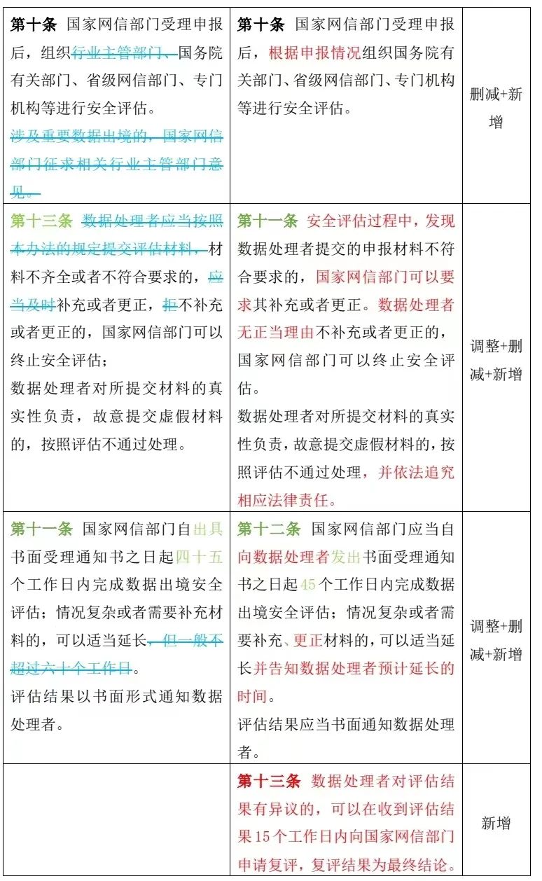 第十一條國(guó)家網(wǎng)信部門自出具書面受理通知書之日起四十五個(gè)工作日內(nèi)完成數(shù)據(jù)出境安全評(píng)估;情況復(fù)雜或者需要補(bǔ)充材料的,可以適當(dāng)延長(zhǎng),但一般不超過六十個(gè)工作日。 評(píng)估結(jié)果以書面形式通知數(shù)據(jù)處理者。 | 第十二條國(guó)家網(wǎng)信部門應(yīng)當(dāng)自向數(shù)據(jù)處理者發(fā)出書面受理通知書之日起45個(gè)工作日內(nèi)完成數(shù)據(jù)出境安全評(píng)估;情況復(fù)雜或者需要補(bǔ)充、更正材料的,可以適當(dāng)延長(zhǎng)并告知數(shù)據(jù)處理者預(yù)計(jì)延長(zhǎng)的時(shí)間。 評(píng)估結(jié)果應(yīng)當(dāng)書面通知數(shù)據(jù)處理者 |
