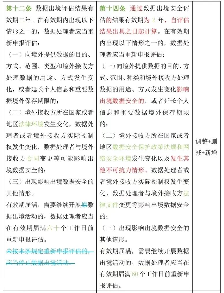 第十二條 數(shù)據(jù)出境評(píng)估結(jié)果有效期二年。在有效期內(nèi)出現(xiàn)以下情形之一的,數(shù)據(jù)處理者應(yīng)當(dāng)重新申報(bào)評(píng)估: (一)向境外提供數(shù)據(jù)的目的、方式、范圍、類型和境外接收方處理數(shù)據(jù)的用途、方式發(fā)生變化,或者延長(zhǎng)個(gè)人信息和重要數(shù)據(jù)境外保存期限的; (二)境外接收方所在國(guó)家或者地區(qū)法律環(huán)境發(fā)生變化,數(shù)據(jù)處理者或者境外接收方實(shí)際控制權(quán)發(fā)生變化,數(shù)據(jù)處理者與境外接收方合同變更等可能影響出境數(shù)據(jù)安全的; (三)出現(xiàn)影響出境數(shù)據(jù)安全的其他情形。 有效期屆滿,需要繼續(xù)開展原數(shù)據(jù)出境活動(dòng)的,數(shù)據(jù)處理者應(yīng)當(dāng)在有效期屆滿六十個(gè)工作日前重新申報(bào)評(píng)估。未按本條規(guī)定重新申報(bào)評(píng)估的,應(yīng)當(dāng)停止數(shù)據(jù)出境活動(dòng)。 | 第十四條 通過數(shù)據(jù)出境安全評(píng)估的結(jié)果有效期為2年,自評(píng)估結(jié)果出具之日起計(jì)算。在有效期內(nèi)出現(xiàn)以下情形之一的,數(shù)據(jù)處理者應(yīng)當(dāng)重新申報(bào)評(píng)估: (一)向境外提供數(shù)據(jù)的目的、方式、范圍、種類和境外接收方處理數(shù)據(jù)的用途、方式發(fā)生變化影響出境數(shù)據(jù)安全的,或者延長(zhǎng)個(gè)人信息和重要數(shù)據(jù)境外保存期限的; (二)境外接收方所在國(guó)家或者地區(qū)數(shù)據(jù)安全保護(hù)政策法規(guī)和網(wǎng)絡(luò)安全環(huán)境發(fā)生變化以及發(fā)生其他不可抗力情形、數(shù)據(jù)處理者或者境外接收方實(shí)際控制權(quán)發(fā)生變化、數(shù)據(jù)處理者與境外接收方法律文件變更等影響出境數(shù)據(jù)安全的; (三)出現(xiàn)影響出境數(shù)據(jù)安全的其他情形。 有效期屆滿,需要繼續(xù)開展數(shù)據(jù)出境活動(dòng)的,數(shù)據(jù)處理者應(yīng)當(dāng)在有效期屆滿60個(gè)工作日前重新申報(bào)評(píng)估。 |