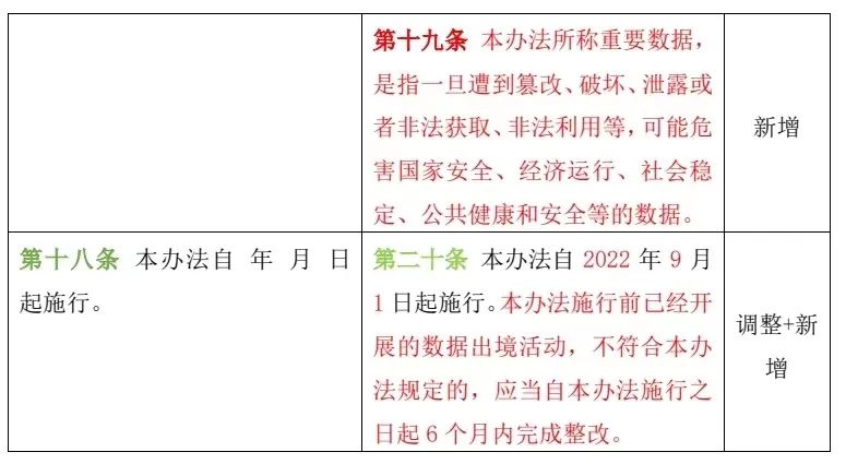 第十八條 本辦法自 年 月 日起施行。 | 第二十條 本辦法自2022年9月1日起施行。本辦法施行前已經(jīng)開展的數(shù)據(jù)出境活動(dòng),不符合本辦法規(guī)定的,應(yīng)當(dāng)自本辦法施行之日起6個(gè)月內(nèi)完成整改。 |