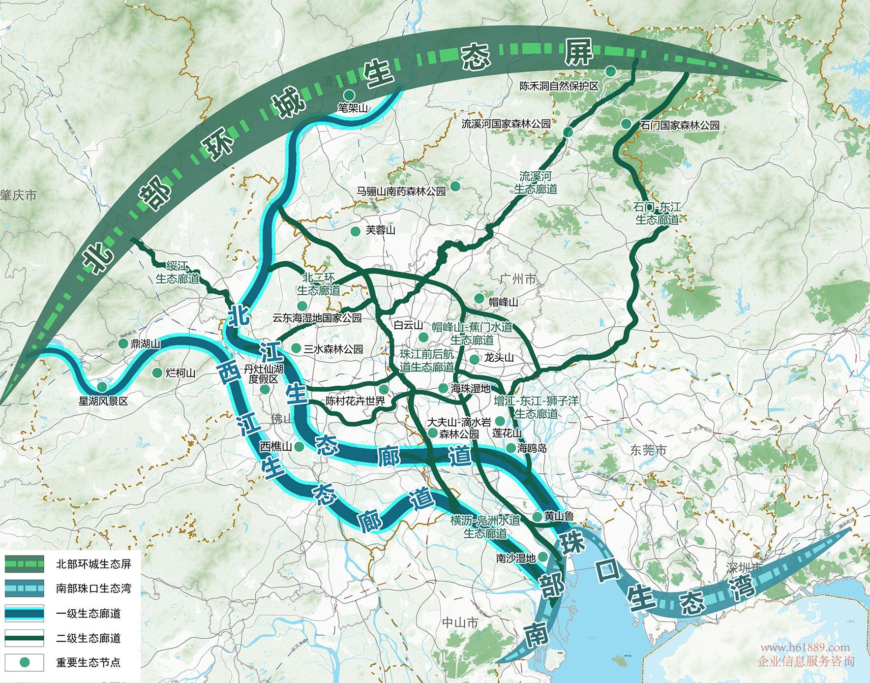 (一)共護(hù)“一屏一灣兩廊多點(diǎn)”生態(tài)安全格局通過維育環(huán)城生態(tài)屏障、珠口生態(tài)灣,以及西江北江等