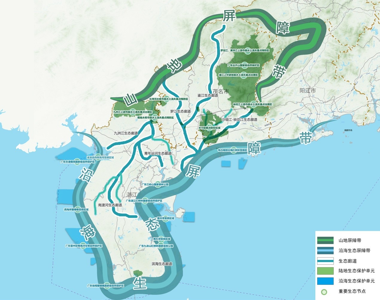 維育山地屏障帶、沿海生態(tài)保護(hù)帶以及鑒江、羅江等河 流廊道構(gòu)建的“兩帶多廊”自然生態(tài)格局,建立全域覆蓋、 分類管理的生態(tài)環(huán)境分區(qū)管控體系?!皟蓭А奔瓷降仄琳蠋?/span> 和沿海生態(tài)保護(hù)帶。其中,山地屏障帶包含大霧嶺、三官山 和鵝凰嶂等山體及鶴地水庫、九洲江等水源周邊的低丘等, 重點(diǎn)推進(jìn)水源涵養(yǎng)、水土保持、生物多樣性保護(hù)等生態(tài)保護(hù) 修復(fù)工程,強(qiáng)化其對(duì)都市圈的生態(tài)保障作用。沿海生態(tài)保護(hù) 帶包含河口、防護(hù)林帶、濱海濕地、海灣、海島以及近海水 域等,重點(diǎn)加強(qiáng)對(duì)國家級(jí)紅樹林自然保護(hù)區(qū)、雷州珍稀海洋 生物國家級(jí)自然保護(hù)區(qū)、徐聞國家級(jí)珊瑚礁自然保護(hù)區(qū)、茂 名虎頭山-晏鏡嶺防護(hù)林等區(qū)域的保護(hù)修復(fù),發(fā)揮陸海交互 帶的緩沖作用,維護(hù)海岸帶生態(tài)安全?!岸嗬取敝饕b 江、羅江、沙瑯江-袂花江、雷州青年運(yùn)河、九洲江和南渡 河等六條河流生態(tài)廊道,開展水生態(tài)健康保護(hù)、水環(huán)境容量 提升、生態(tài)要素流通暢通等工作,重點(diǎn)打造鑒江畫廊魅力藍(lán) 灣省級(jí)骨干特色碧道。