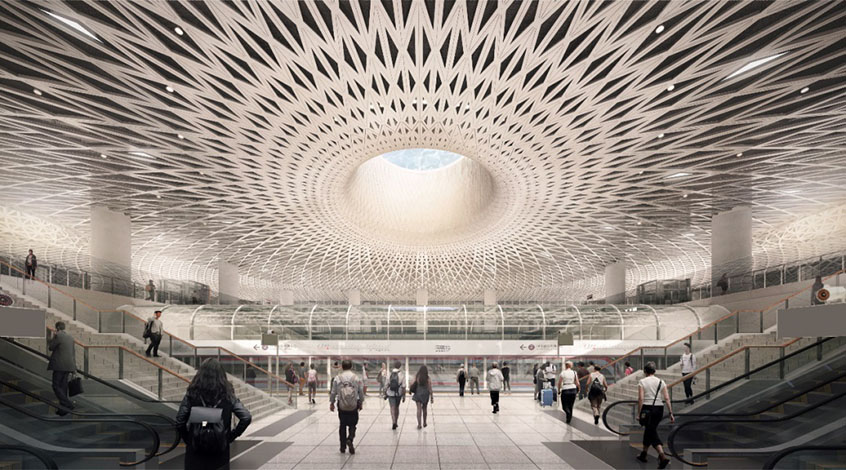 樞紐空間主要分為五個層次,地面層為下沉廣場和地面建構筑物;夾層為城市過街環(huán)廊(和既有地鐵2號線在同一標高);地下一層為樞紐換乘站廳,東、西、南三個區(qū)的地下空間;地下二層為東西向的11、14號線站臺及其軌行區(qū),10號線設備區(qū);地下三層為10號線站臺層,崗廈北地下?lián)Q乘核心區(qū)、東、西、南三部分地下空間。樞紐整體東西總長約900米,南北向總長620米,建筑約24.38萬平方米。為既有地鐵2號線、新建10號線、11號線、14號線換乘節(jié)點,并結合換乘節(jié)點銜接的彩田路、深南大道地下空間商業(yè)開發(fā),同步連通1號線崗廈站