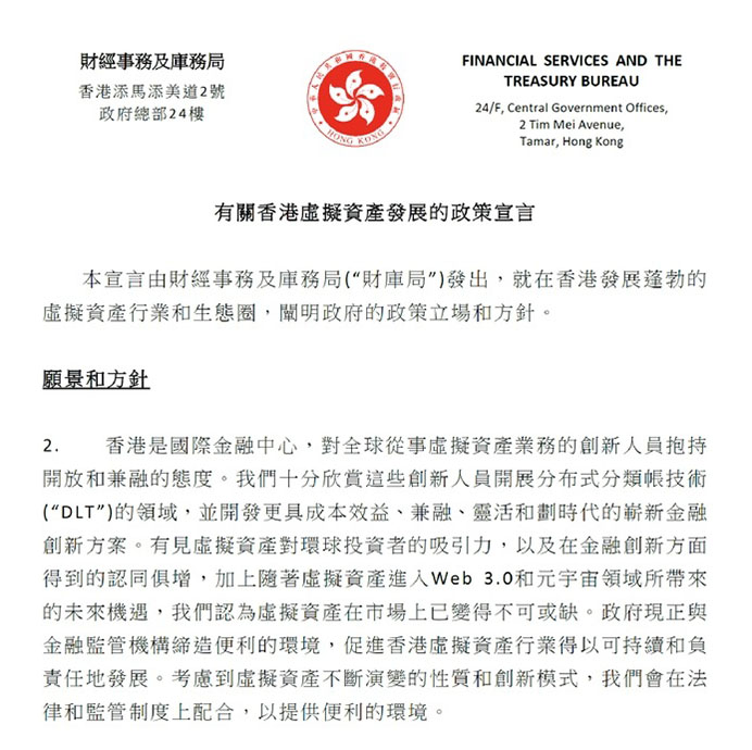 香港:《有關香港虛擬資產發(fā)展的政策宣言》