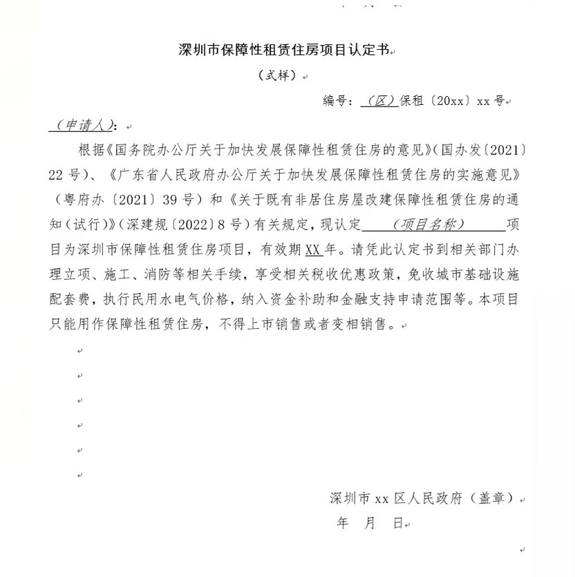深圳市保障性租賃住房項目認定書