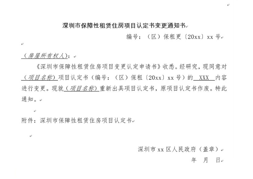 深圳市保障性租賃住房項目認定書變更通知書