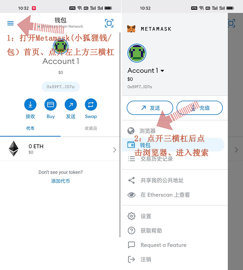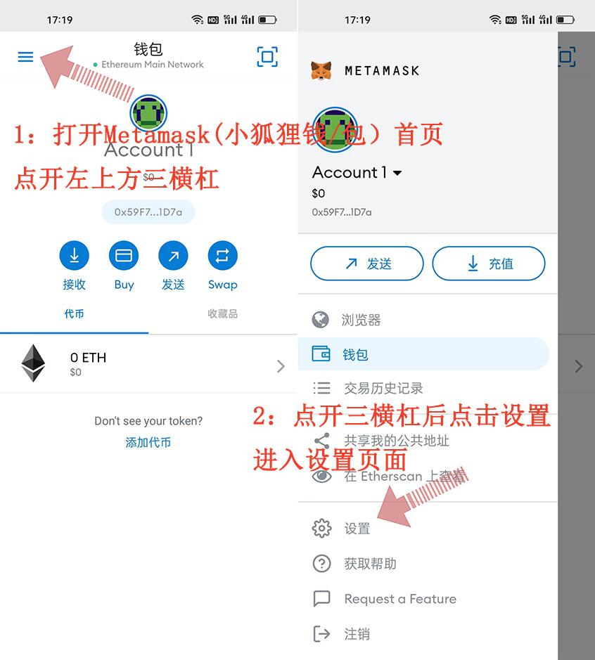 1:打開Metamask(小狐貍錢/包)首頁、點開左上方三橫杠、2:點開三橫杠后點擊設(shè)置、進(jìn)入設(shè)置頁面