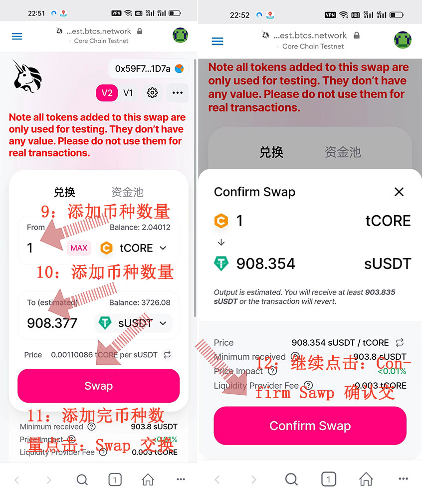 11:添加完幣種數(shù)量點擊:Swap 交換、12:繼續(xù)點擊:Confirm Sawp 確認交換