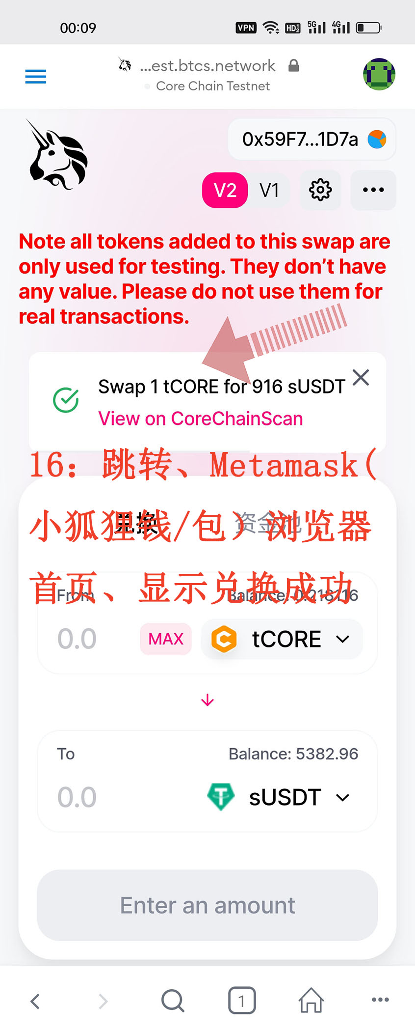 16:跳轉、Metamask(小狐貍錢/包)瀏覽器首頁、顯示兌換成功