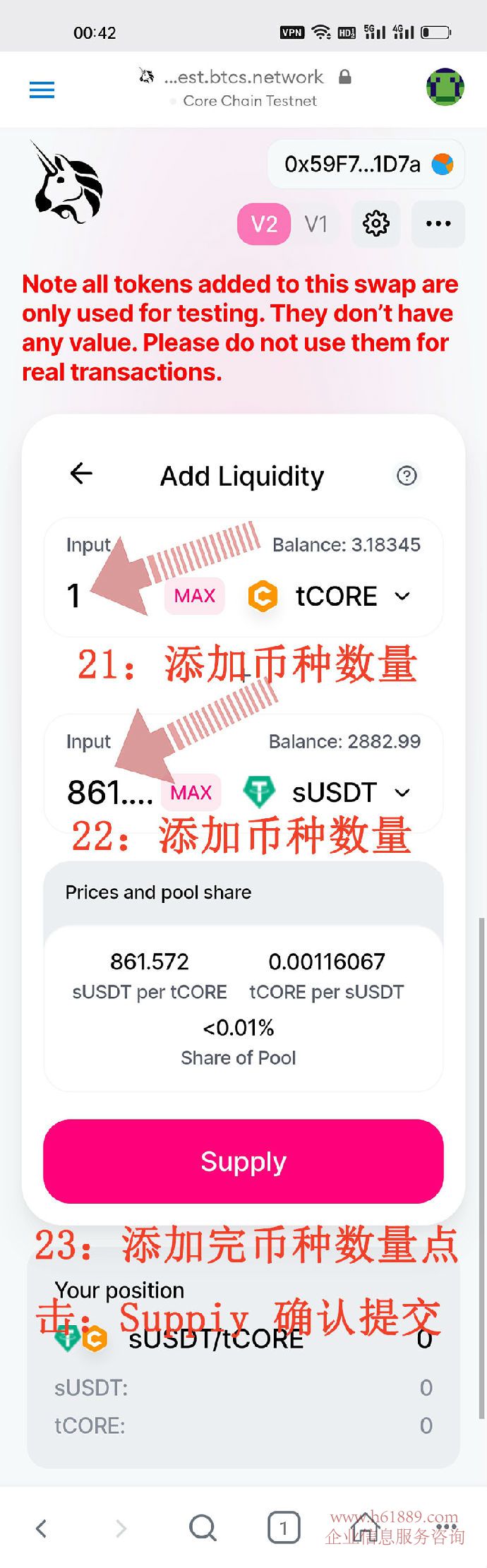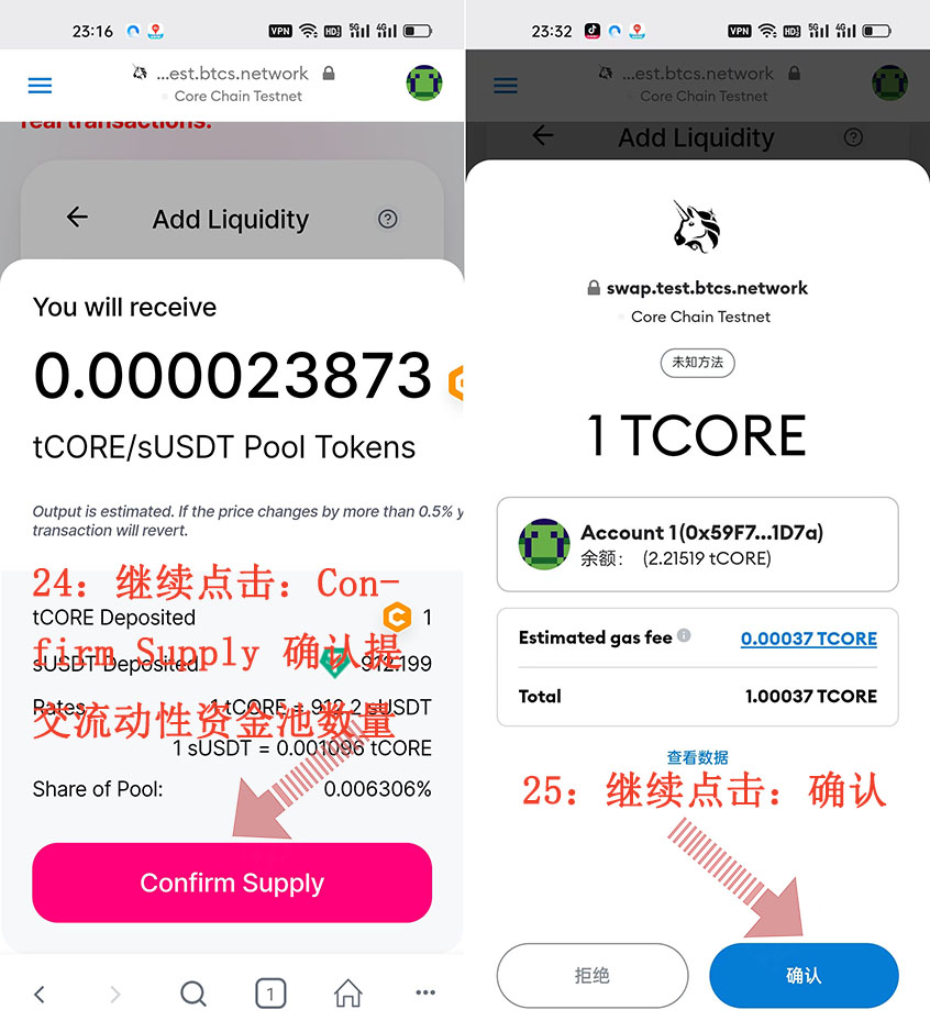 24:繼續(xù)點擊:Confirm Supply 確認提交流動性資金池數(shù)量、25:繼續(xù)點擊:確認