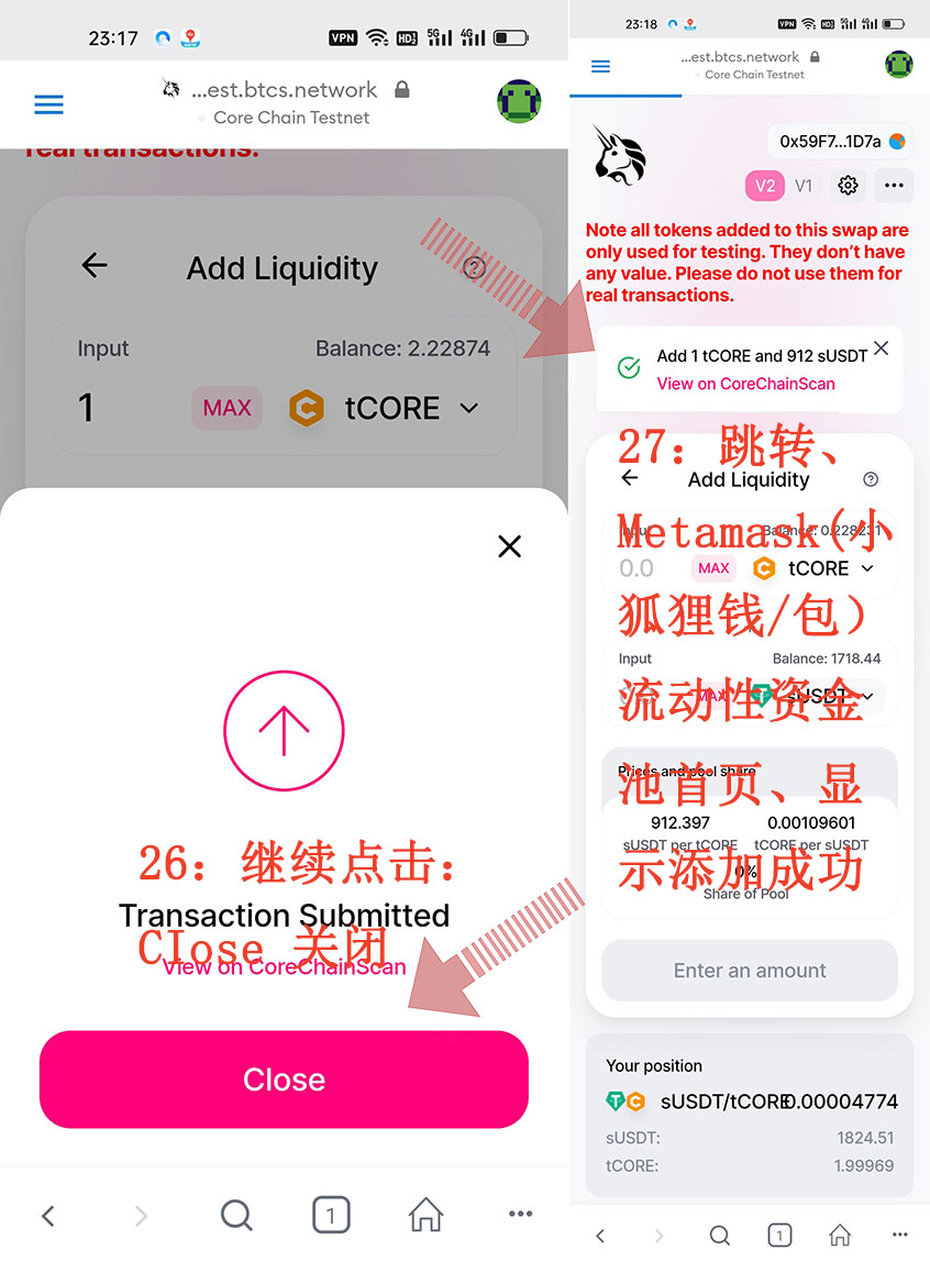 26:繼續(xù)點擊:CIose 關閉、27:跳轉、Metamask(小狐貍錢/包)流動性資金池首頁、顯示添加成功