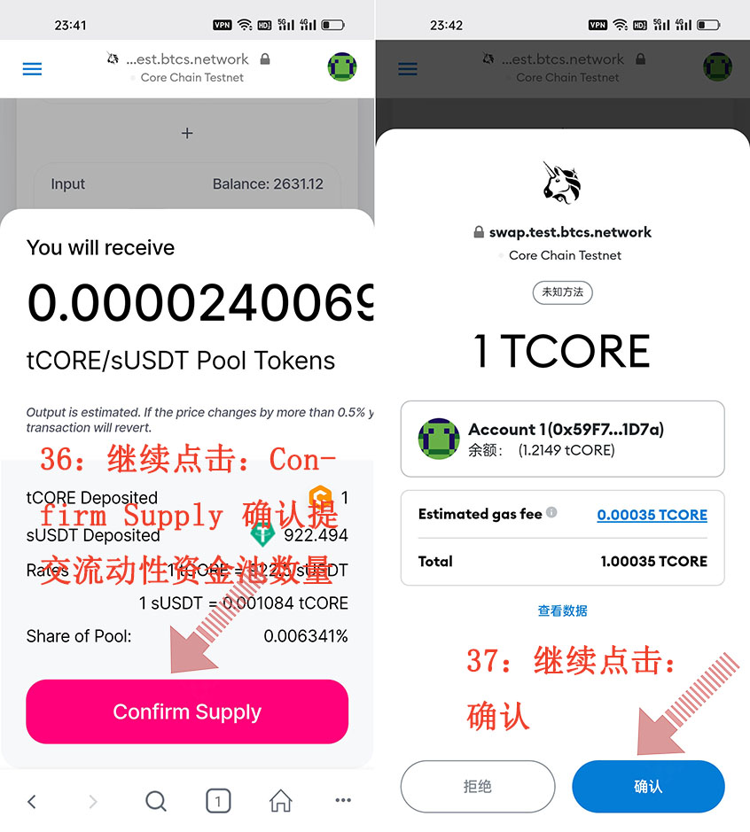36:繼續(xù)點擊:Confirm Supply 確認提交流動性資金池數(shù)量、37:繼續(xù)點擊:確認