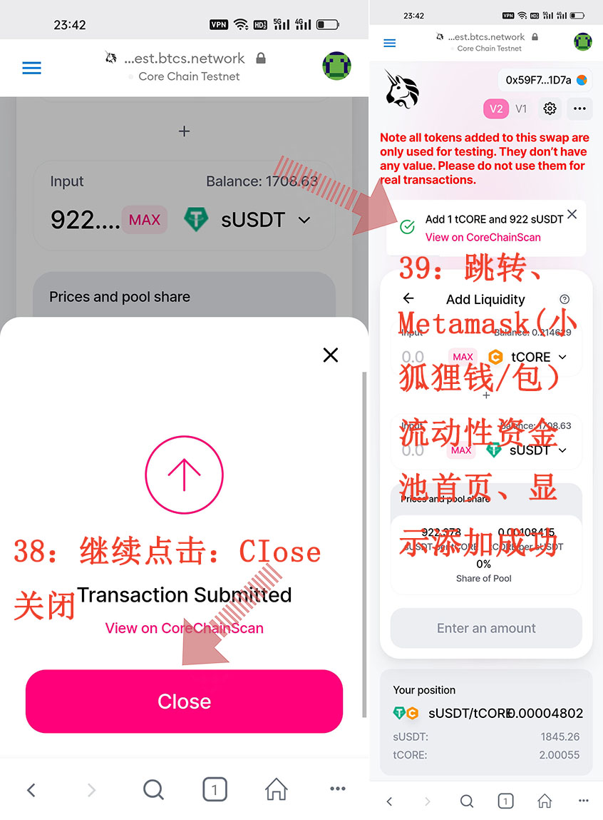 38:繼續(xù)點擊:CIose 關閉、39:跳轉、Metamask(小狐貍錢/包)流動性資金池首頁、顯示添加成功