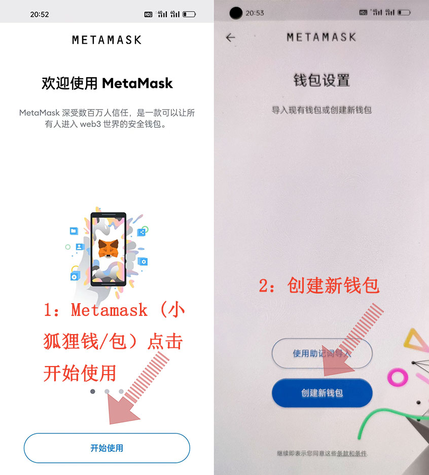 1:Metamask (小狐貍錢/包)點擊:開始使用、2:創(chuàng)建新錢包
