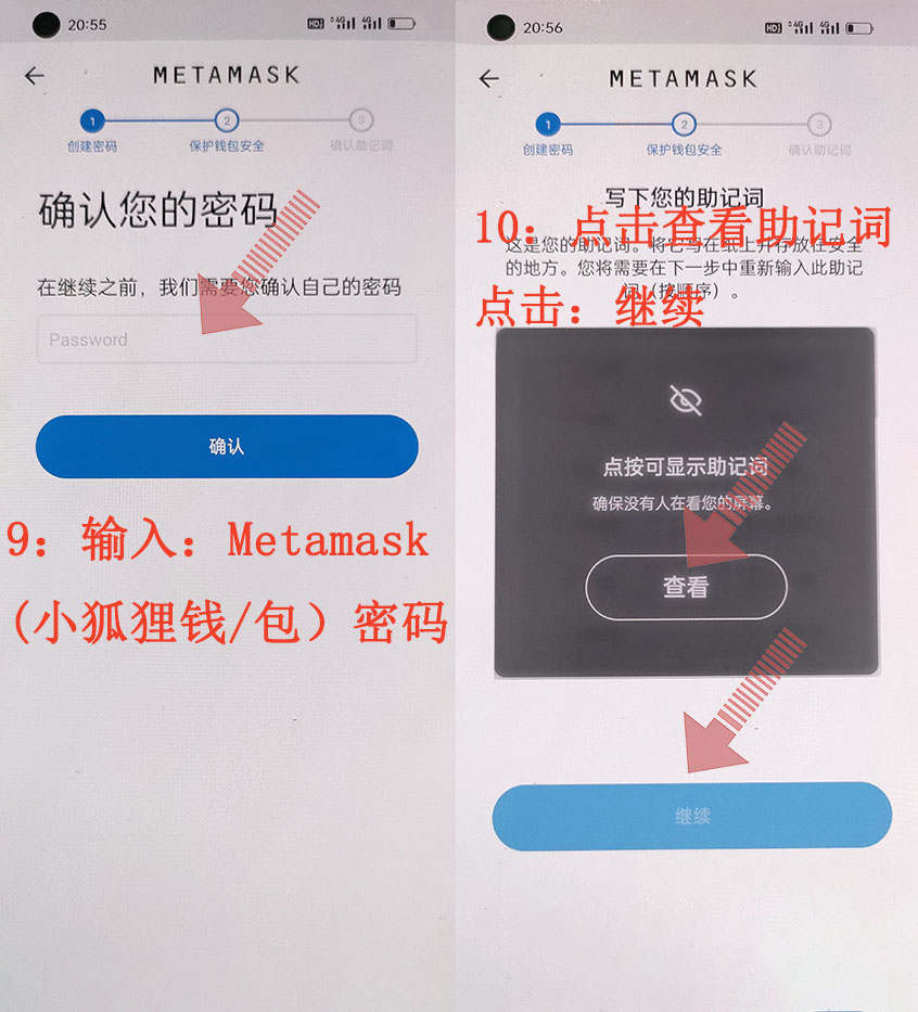 9:輸入:Metamask (小狐貍錢/包)密碼、10:點擊查看助記詞、點擊:繼續(xù)