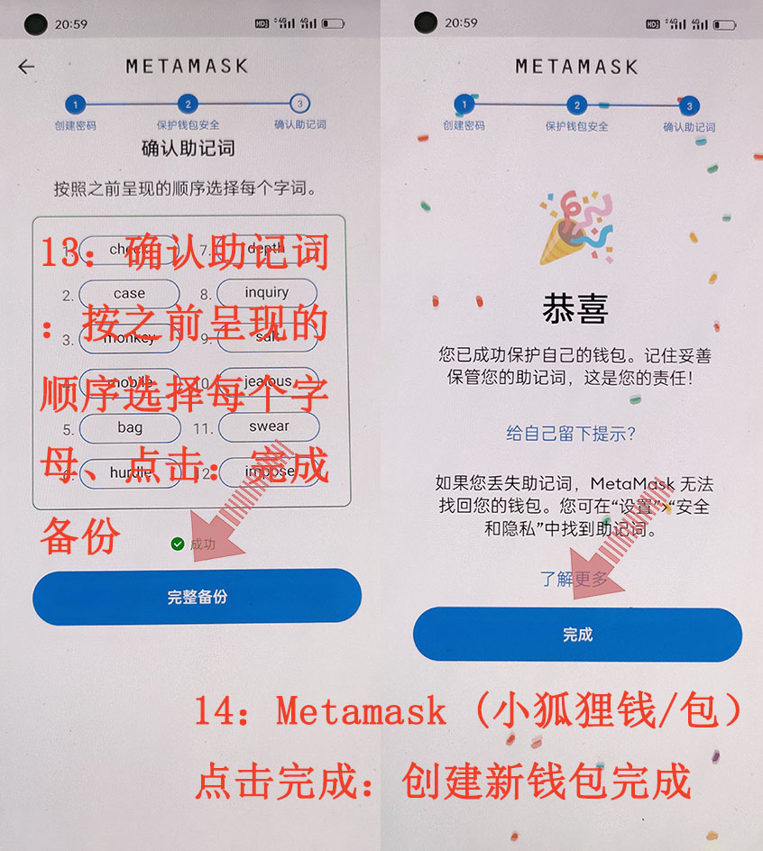13:確認(rèn)助記詞:按之前呈現(xiàn)的順序選擇每個字母、點擊:完成備份、Metamask (小狐貍錢/包)