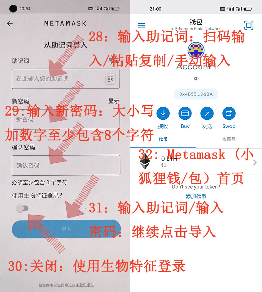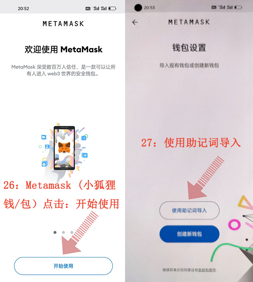 26:Metamask (小狐貍錢/包)點擊:開始使用、27:使用助記詞導(dǎo)入