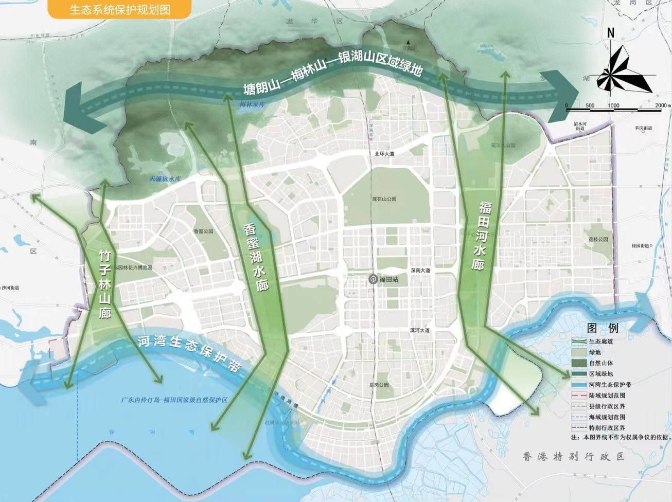 一屏:塘朗山、梅林山、銀湖山為主體構(gòu)成的區(qū)域綠;一帶:由福田紅樹林自然保護(hù)區(qū)、深圳灣海岸線與深圳河生態(tài)廊道構(gòu)成的南部河灣生態(tài)保護(hù)帶;三廊:竹子林山廊、香蜜湖水廊、福田河水廊