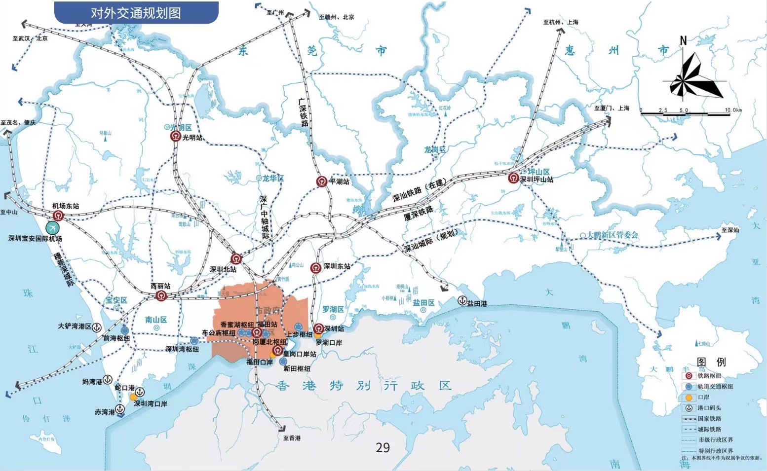 打造輻射大灣區(qū)的核心樞紐:建設(shè)“一中樞、雙口岸、多線路”對外交通體系:強(qiáng)化福田高鐵站綜合交通樞紐地位,完善皇崗口岸、福田口岸功能, 推進(jìn)城際網(wǎng)絡(luò)建設(shè)