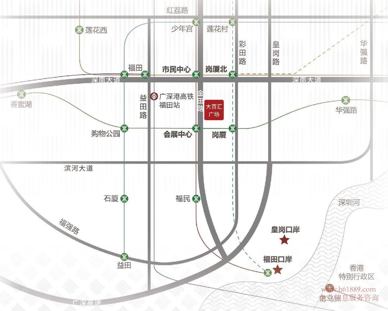 灣區(qū)立體樞紐:全球飛速切換、福田口岸(5分鐘)/皇崗口岸(10分鐘)、香港國際機場(30分鐘)、深圳寶安機場T3 (40分鐘)、亞洲最大的軌道交通樞紐-廣深港高鐵福田站(5分鐘)、(直線距離約600米,14分鐘可達香港西九龍)、城市中心地下交通樞紐-5站8線地鐵環(huán)繞、會展中心站、崗廈站、崗廈北站、市民中心、福田站:1、2、3、4、7、10、11、14號線已開通