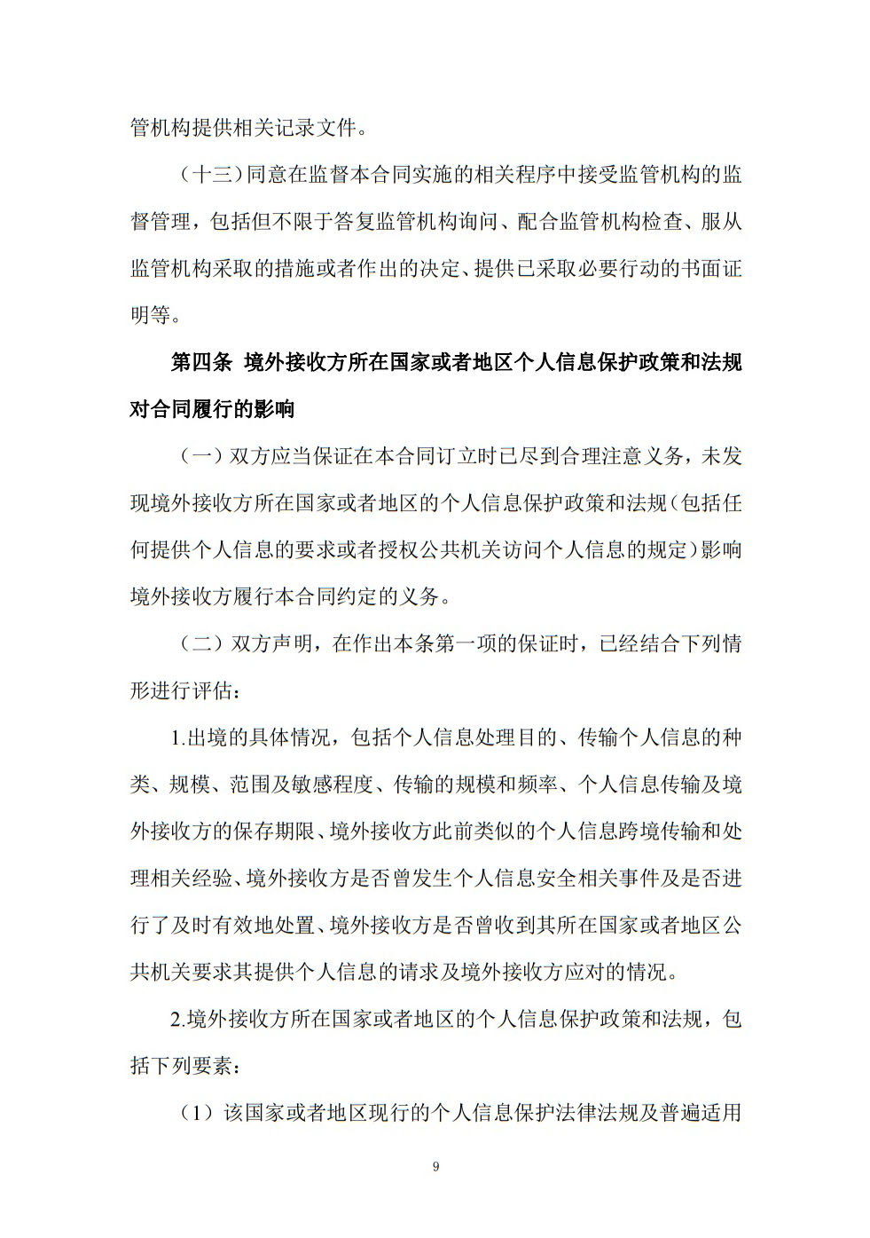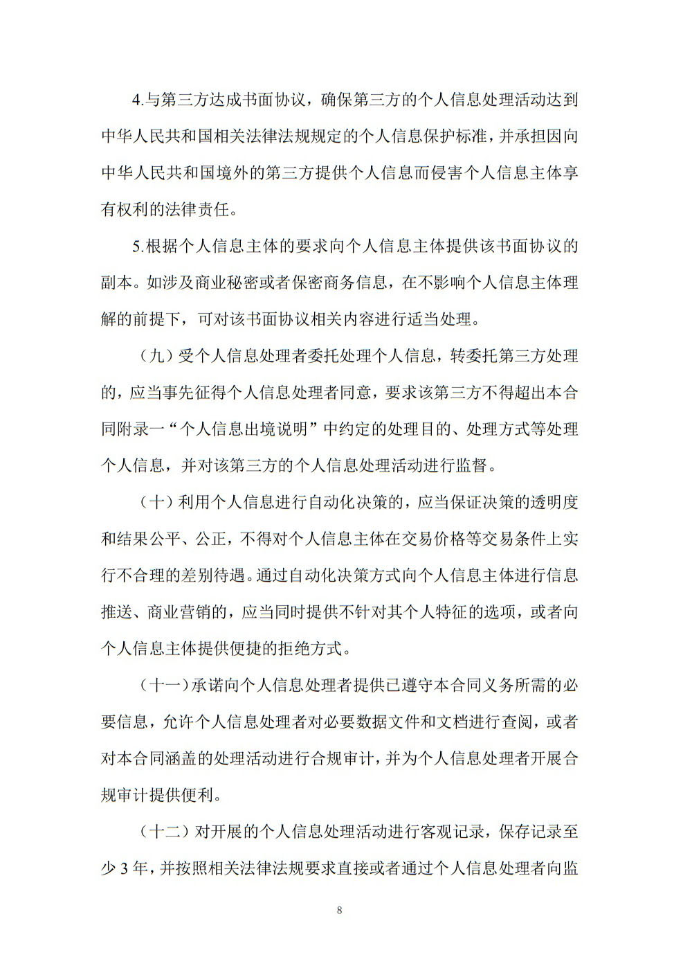 第八條 在標(biāo)準(zhǔn)合同有效期內(nèi)出現(xiàn)下列情形之一的,個(gè)人信息處理者應(yīng)當(dāng)重新開展個(gè)人信息保護(hù)影響評(píng)估,補(bǔ)充或者重新訂立標(biāo)準(zhǔn)合同,并履行相應(yīng)備案手續(xù):