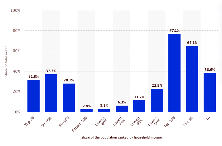 在過(guò)去的幾十年里,全球財(cái)富分配的不平等變得更加明顯。截至 2022 年,美國(guó)最富有的10%的人擁有美國(guó)近70%的財(cái)富,這意味著該國(guó)90%的人只擁有30%的財(cái)富。在南非,收入最高的10%的人占有65%的財(cái)富