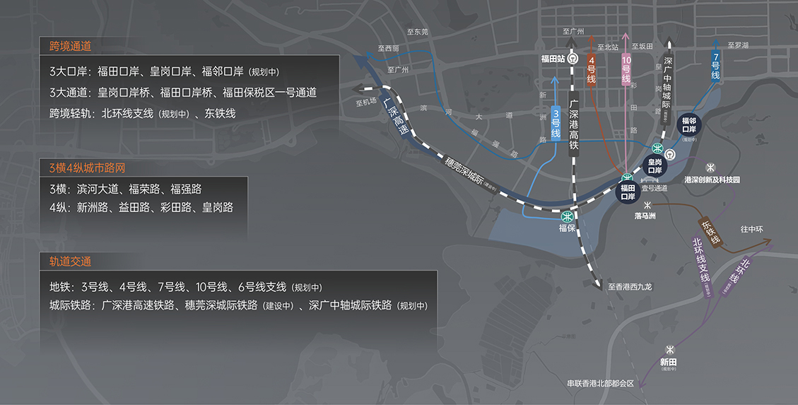 深港直聯(lián)直通 暢達灣區(qū)接軌國際跨境交通:3大口岸+3大通道3橫4縱城市路網(wǎng)軌道交通:5條地鐵+3條城際鐵路