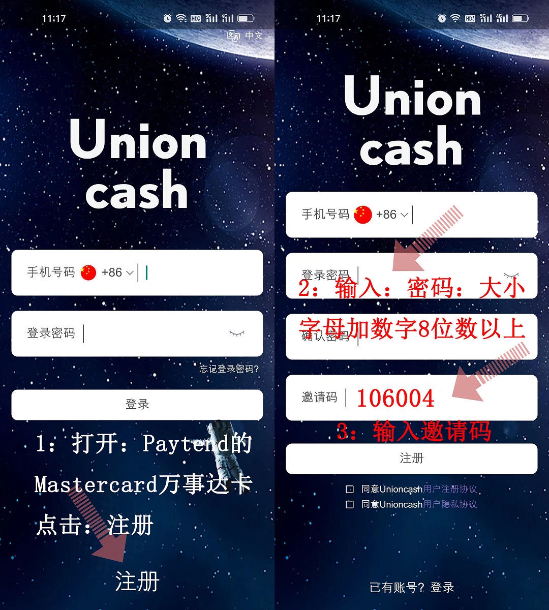 1:打開:Paytend的Mastercard萬事達卡、點擊:注冊