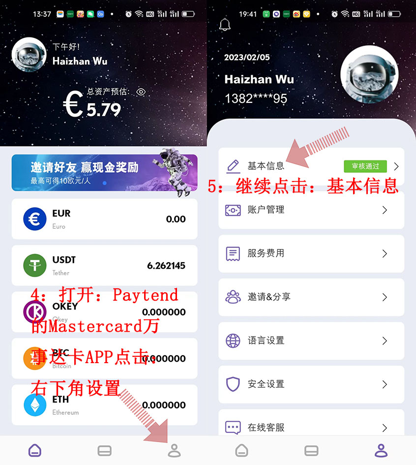 4:打開:Paytend的Mastercard萬事達卡APP、點擊:右下角設(shè)置、5:繼續(xù)點擊:基本信息