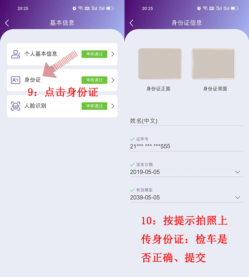 9:點擊身份證、10:按提示拍照上傳身份證:檢車是否正確、提交