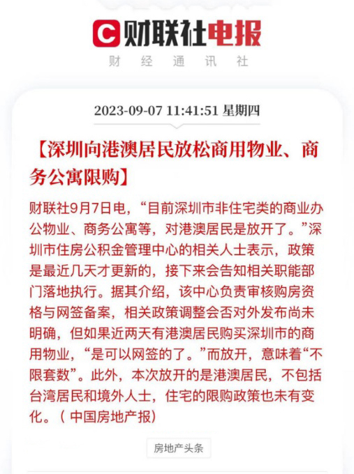 2023年9月7日從深圳市住房公積金管理中心的相關人士處獲悉,“目前深圳市非住宅類的商業(yè)辦公物業(yè)、商務公寓等,對港澳居民是放開了?!痹撊耸勘硎?,政策是最近幾天才更新的,接下來會告知相關職能部門落地執(zhí)行