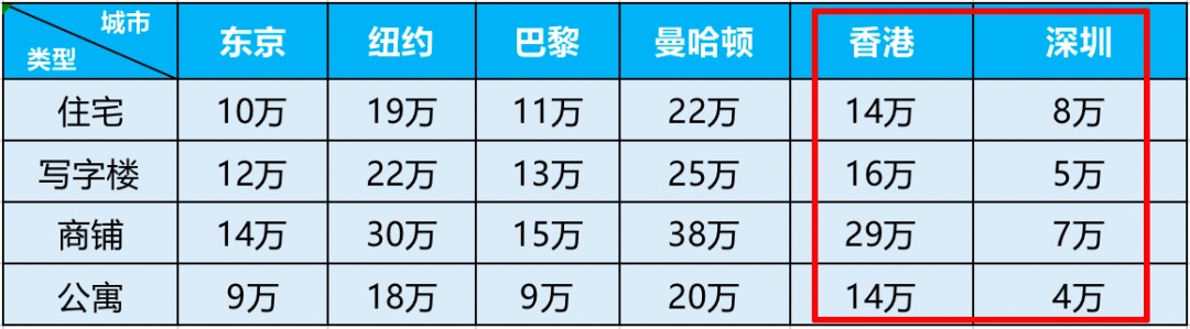 具體來看,深圳的商辦產品價格與香港相差近4倍,與曼哈頓相差近5倍,與東京相差近2倍