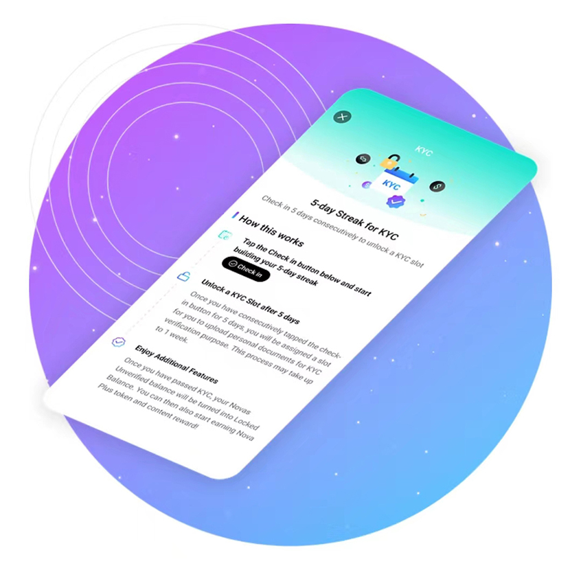 用戶在連續(xù)登錄 Nova Network 一定數(shù)量的天數(shù)后有資格進(jìn)行KYC。一旦您通過了 KYC,您可以開始同時(shí)獲得 Novas Plus 代幣和 Novas 代幣的獎(jiǎng)勵(lì)。