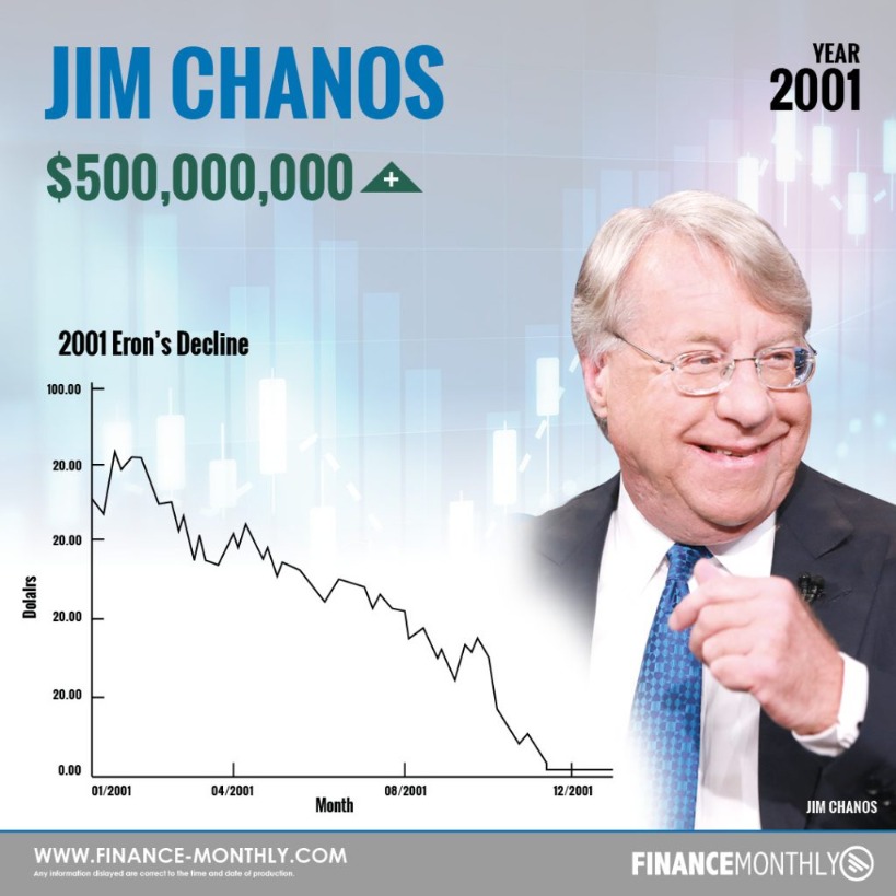 2001年:美國安然破產前幾個月、查諾斯做空該公司賺得盆滿缽滿、2008年金融海嘯、他又通過做空大賺一筆,從而聲名遠揚、成為一個傳奇做空者